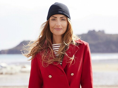 The “Detroit Or” peacoat, in French woollen cloth, takes on a sailor style while keeping a touch of femininity with its fitted cut, underlined by a martingale in the back. Thanks to its navy anchor buttons in gold metal and its navy blue color, this peacoat brings elegance to your outfit.
